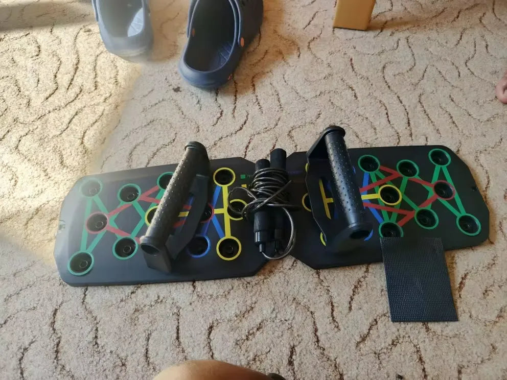 The set includes a sturdy push up board, anti-slip handles, and tension ropes, making it a complete home gym solution.